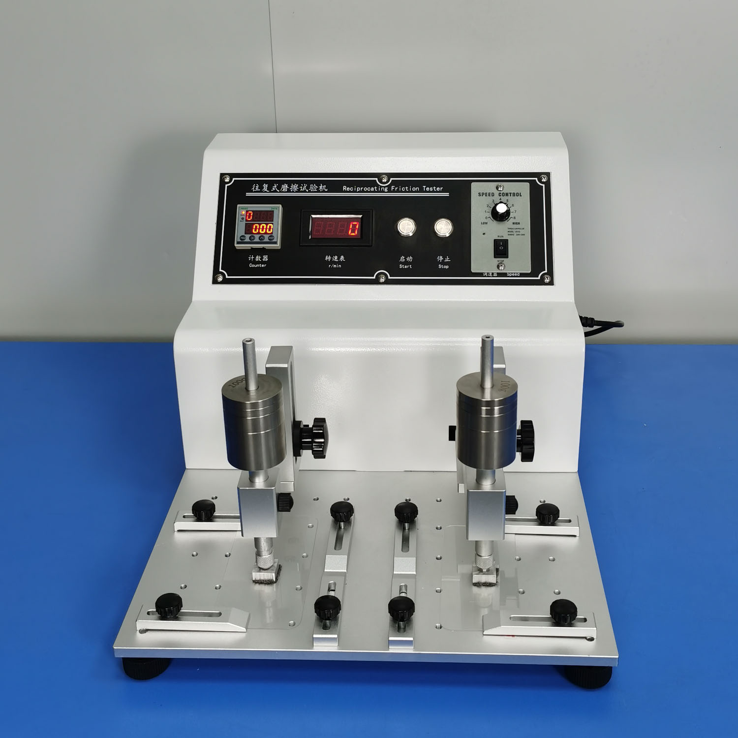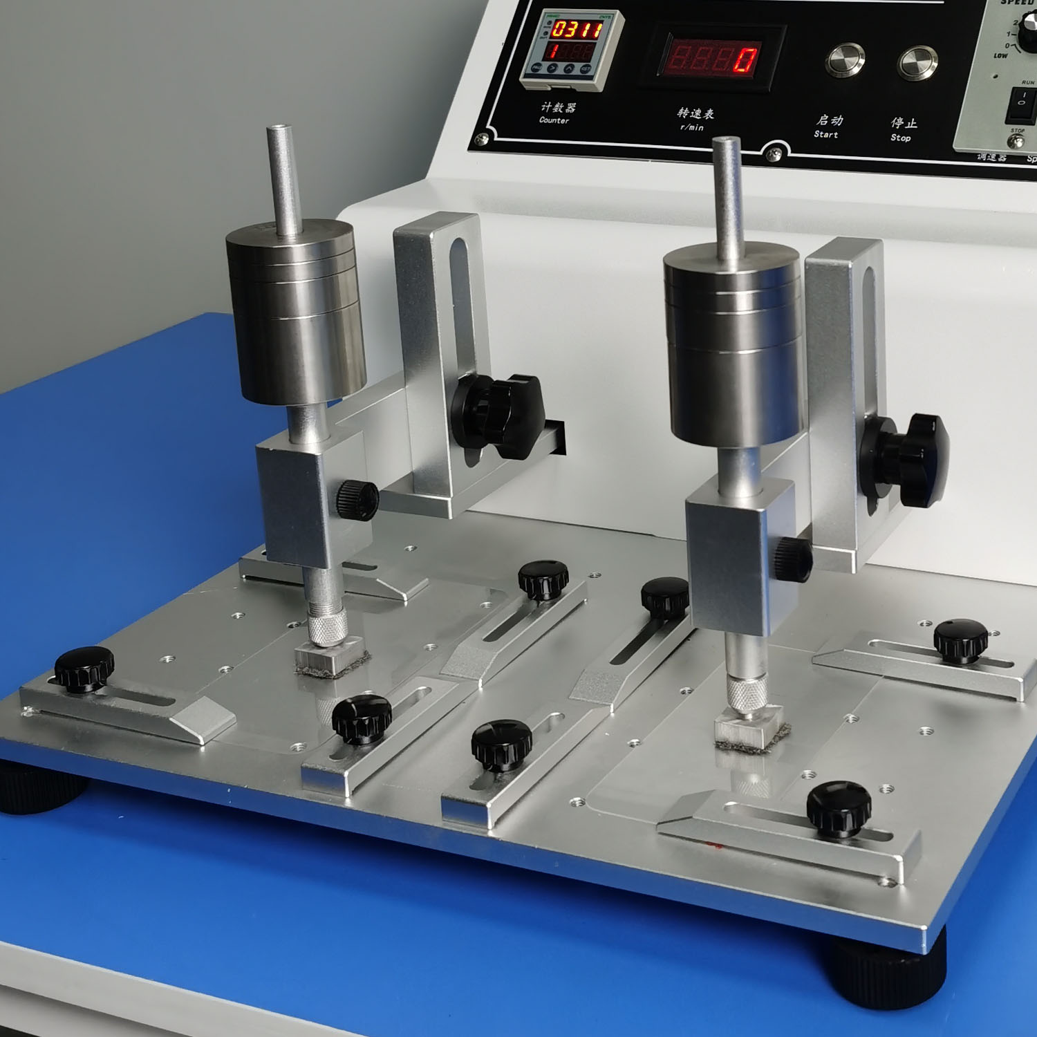 酒精/橡皮耐磨试验机 A20-339 本体为不锈钢制成,适用于各种非导体涂膜层之耐磨耗试验,可使用钢丝棉、橡皮擦或酒精磨擦布料之耐磨耗试验。 磨擦频率: 无段式可调整转速频率(LED显示) 磨擦计数器: 可调整 0 - 9999 次 磨擦速度: 20 - 65 次 (可调) 磨擦距离: 10mm - 50mm 可自由调整 测试杆可上下高低调整需要的距离 外形尺寸:550×400×330mm(长.宽.高) 测试用举杆 80克 2支 酒精、圆形橡皮磨擦头 各2支 砝码 500克 2只 砝码 200克 2只 砝码 100克 2只 砝码 50克 2只 砝码 25克 2只 砝码 20克 2只 砝码 10克 2只 板手 1只 橡皮擦 1条、白棉布10片 砂纸 1片 大头螺丝加长 4个 标准夹具 4块